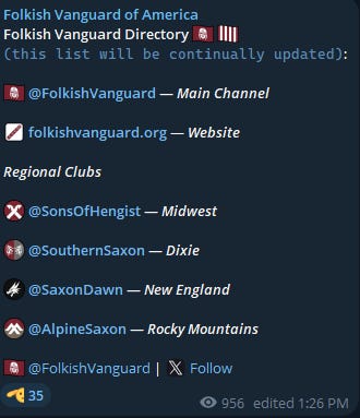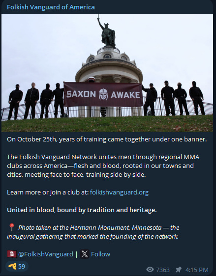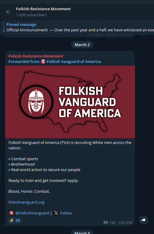 The Folkish Vanguard of America is their internal communications hub. This is where they post recruiting messages and internal propaganda. This is similar to Active Club Official and White Lads Aesthetics within the Active Club network.