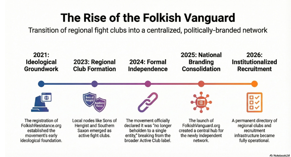 The Folkish Vanguard is a small network of four white supremacist fight clubs that recently broke away from the Active Club ecosystem. My assessment is that this is the first clearly coordinated split where multiple former Active Club nodes rebranded, rebuilt shared infrastructure, and launched a parallel national network. This piece documents the timeline of domains, Telegram channels, and cross-promotion, and explains why this matters: it suggests enforceable governance inside Active Clubs, and it may signal a new model of splintering with a heavier political media posture.