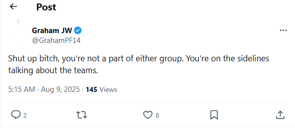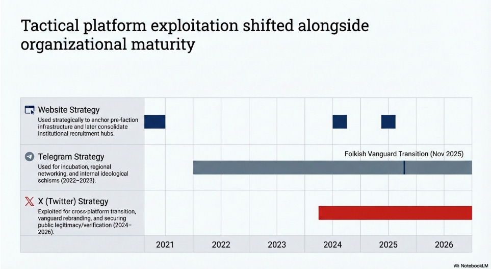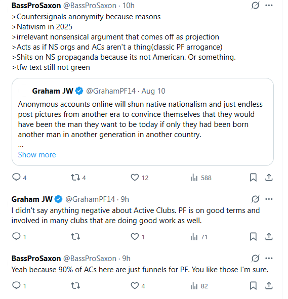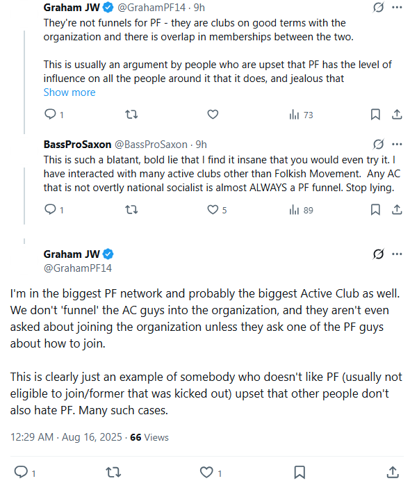In August 2025, a public dispute on X erupted between Folkish Vanguard accounts and a Patriot Front aligned figure who is also a member of an Active Club. The exchange matters less for the insults and more for the timing. FolkishVanguard.org was registered during the same window, suggesting the argument coincided with an infrastructure escalation. I treat this as an inflection point, not a sole cause: the pivot toward autonomy and political-media activity is visible earlier, beginning in January 2024