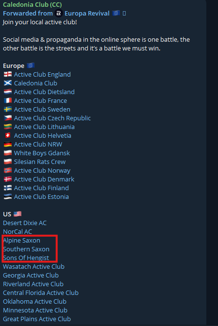 Below is an image from the Caledonia Active Club network, posting a listing of fellow Active Clubs. They list three Folkish Clubs, Alpine Saxon, Southern Saxon, and of Hengist.