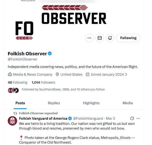 First, the Folkish Vanguard ideological channels have a more overt political element. They are operating as a media and news agency. This is a significant distinction from Media2Rise, the Active Club media arm, which largely produces promotional material for recruiting and propaganda. The screenshot below is from X and shows their news designation and amplification of the Folkish Vanguard.