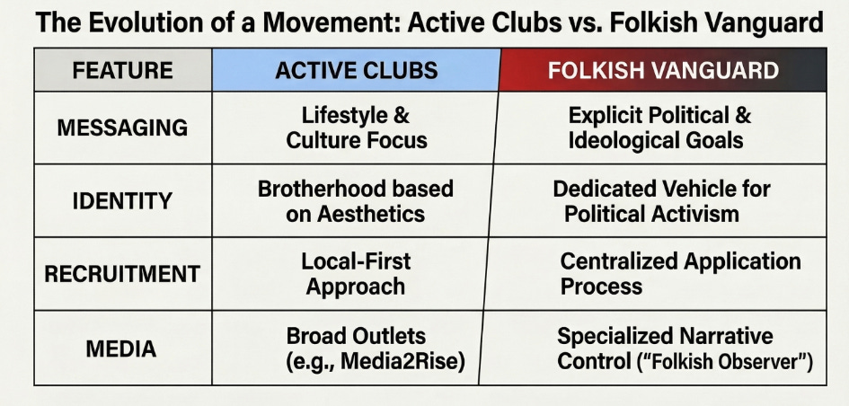 TLDR: The Folkish Vanguard is a new network of white supremacists. They had a pre-existing identity and branding, then they joined the Active Club network. They began showing signs of divergence, and officially announced themselves as an independent group. To my knowledge, this is the first case where multiple clubs recognized as Active Clubs later rebranded and launched a parallel national network.