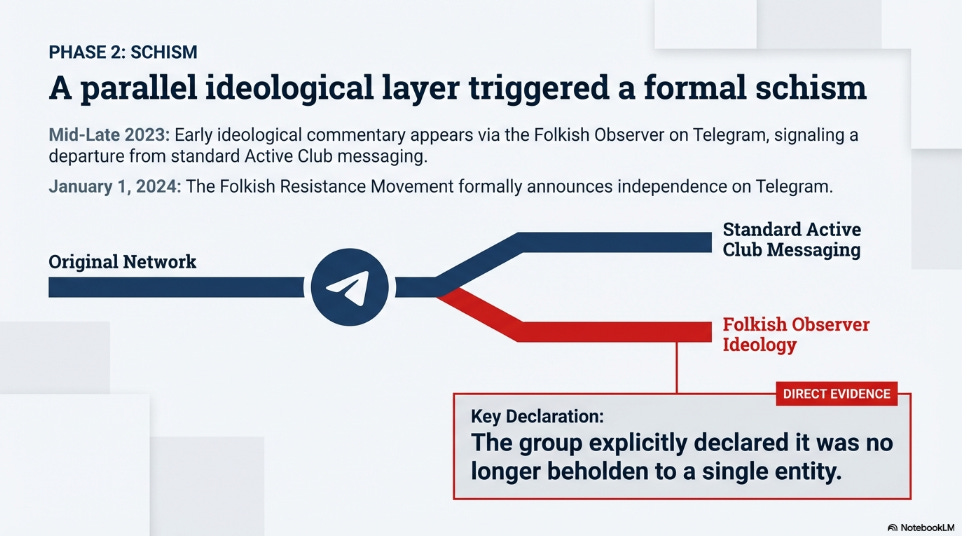 The first sign of divergence was in Jan 2024. The Folkish Resistance Movement channel made an official announcement that they were no longer “beholden to a single entity”, and sought to get more involved in a political movement.